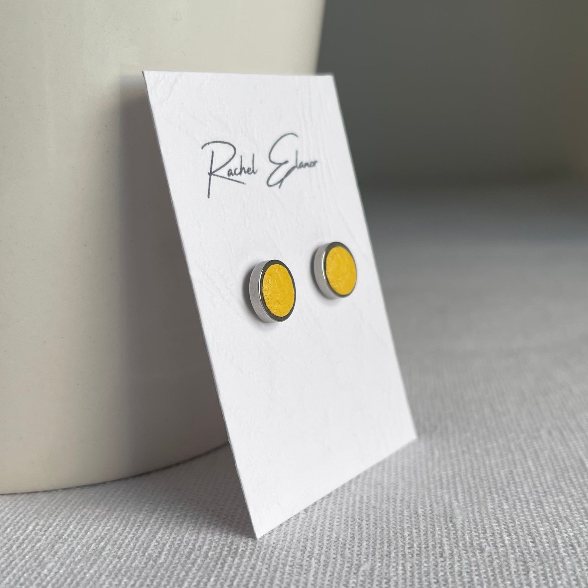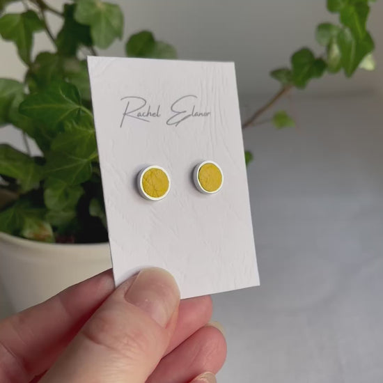Bright yellow leather stud earrings. These studs were designed with comfort in mind being incredibly lightweight and made with hypoallergenic surgical steel so even the most sensitive of ears can enjoy them for hours on end.