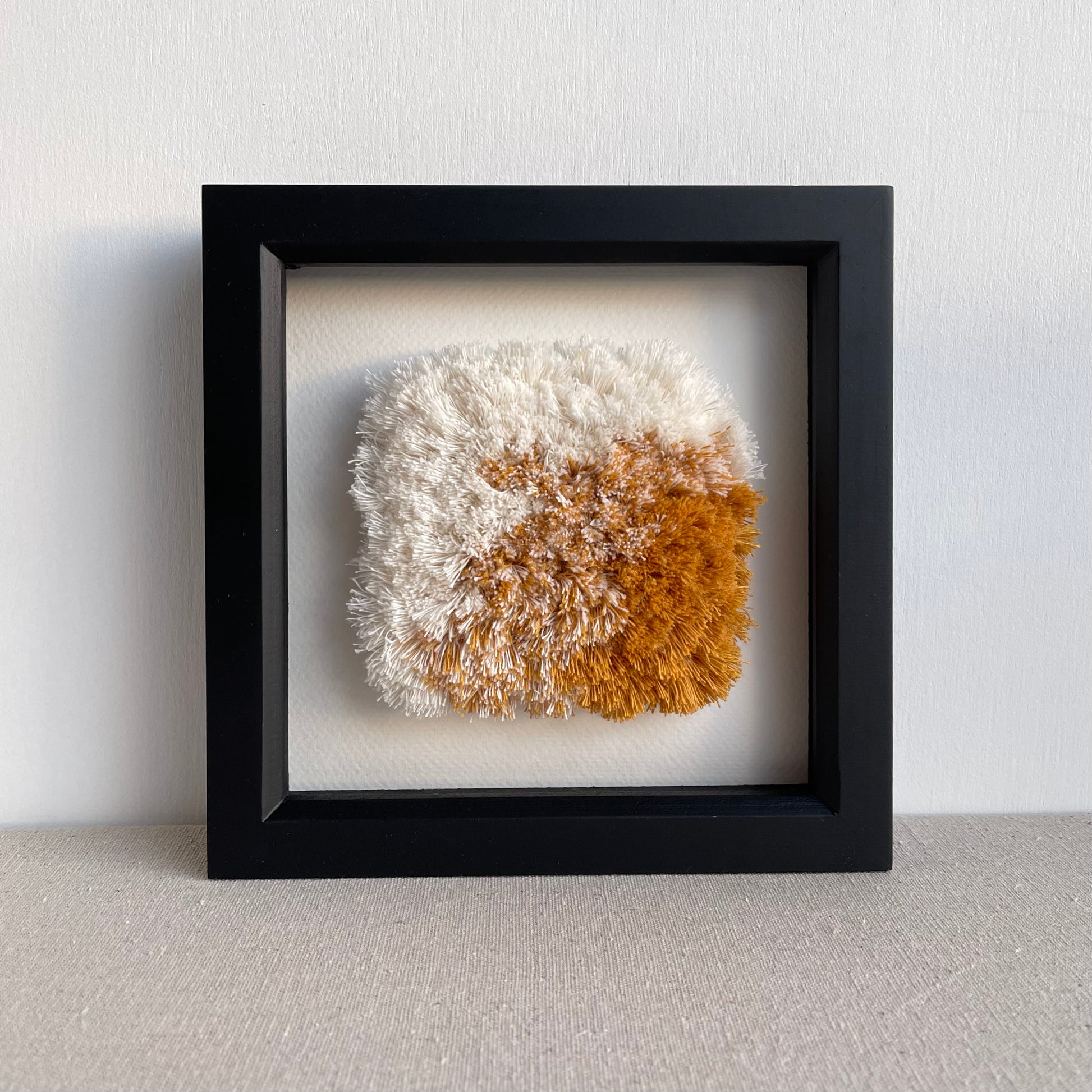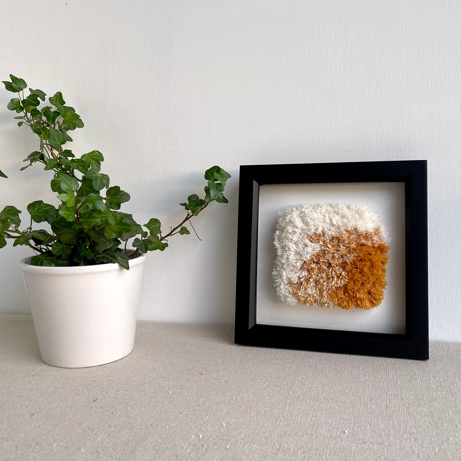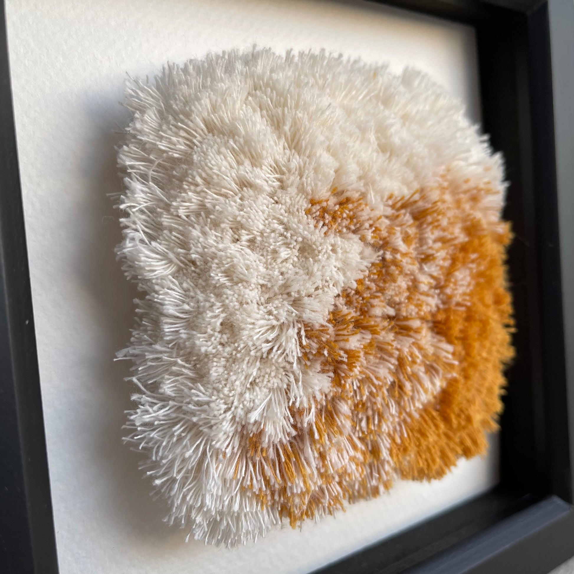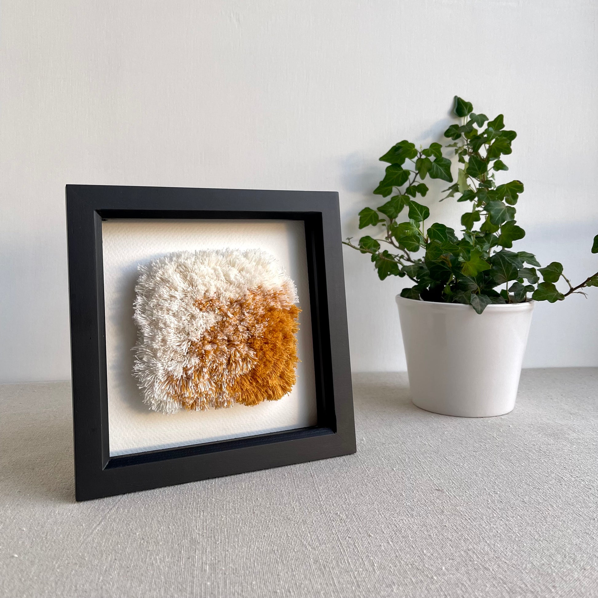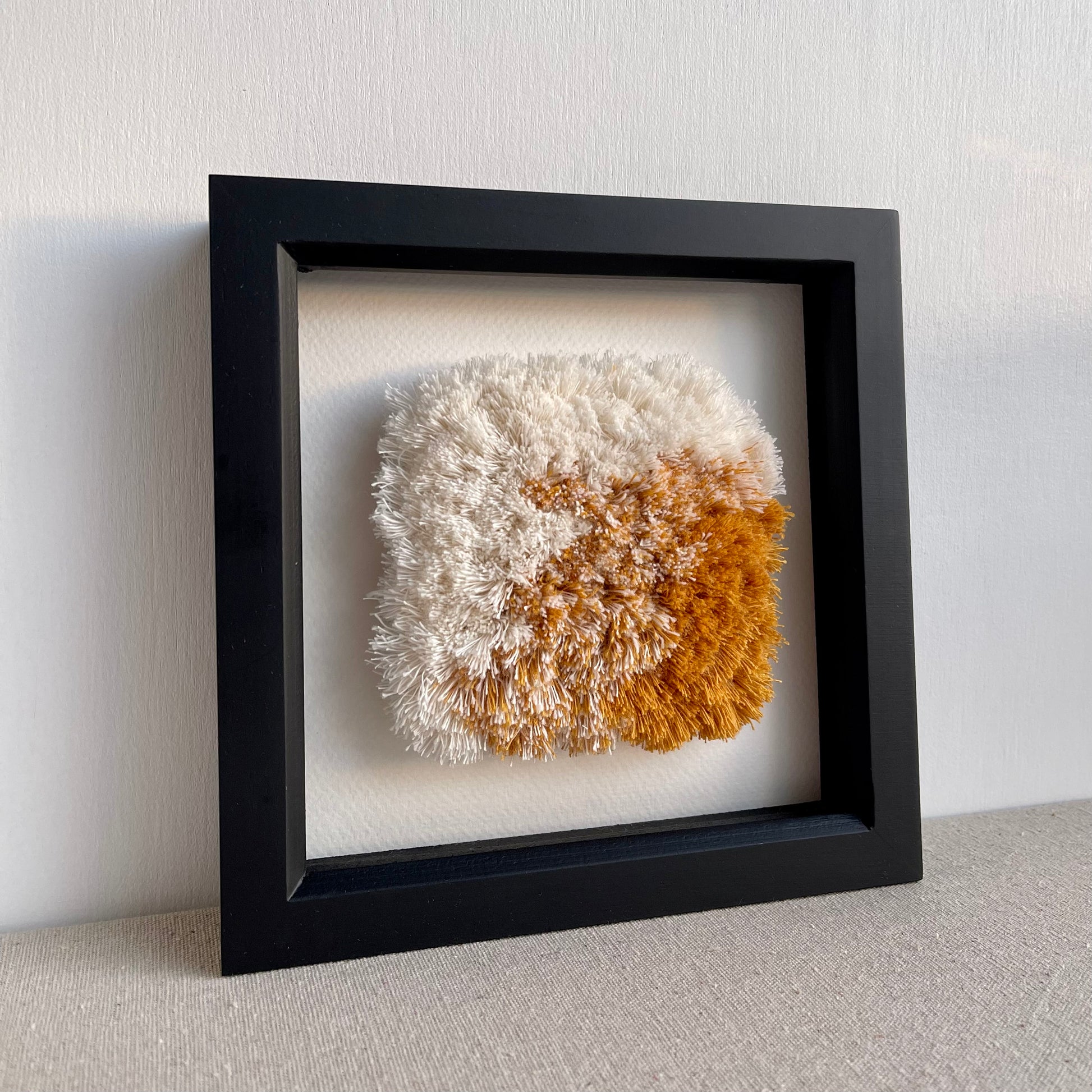 Each fibre art piece is crafted with intention, love and care. Many individual cotton cords are handwoven, teased, trimmed and shaped into the textile sculpture you see in the frame.
