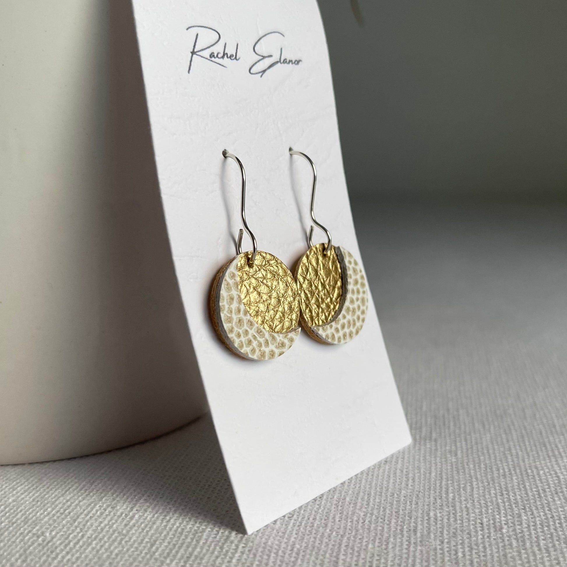 Gold leather earrings with a white and gold crescent moon in a short drop style. These earrings are incredibly lightweight and made with a handmade shepherds hook earwire in recycled 925 sterling silver.