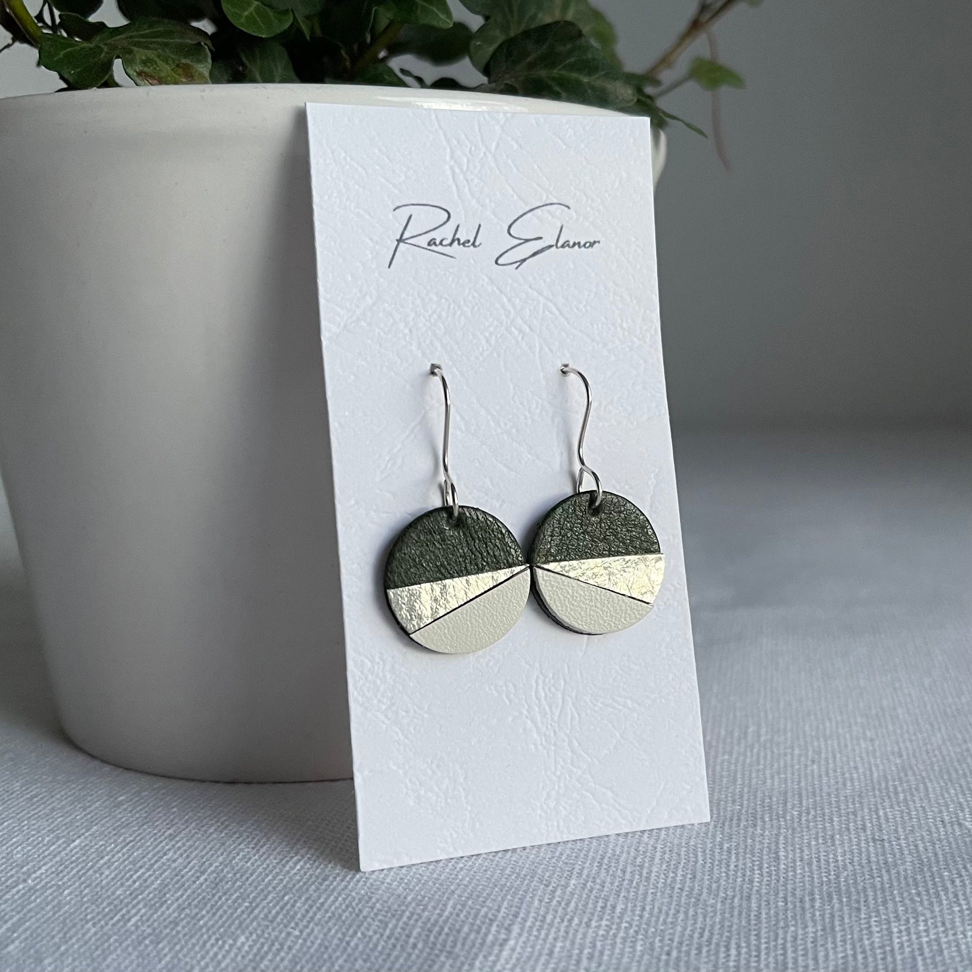 Dark green circle leather earrings with metallic silver and white accents in a short drop style. These earrings are incredibly lightweight and made with a handmade shepherds hook earwire in recycled 925 sterling silver.