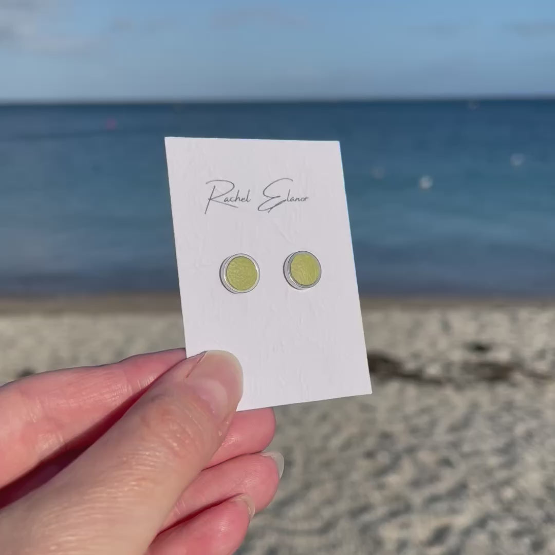 Lime green leather stud earrings. These studs were designed with comfort in mind being incredibly lightweight and made with hypoallergenic surgical steel so even the most sensitive of ears can enjoy them for hours on end.