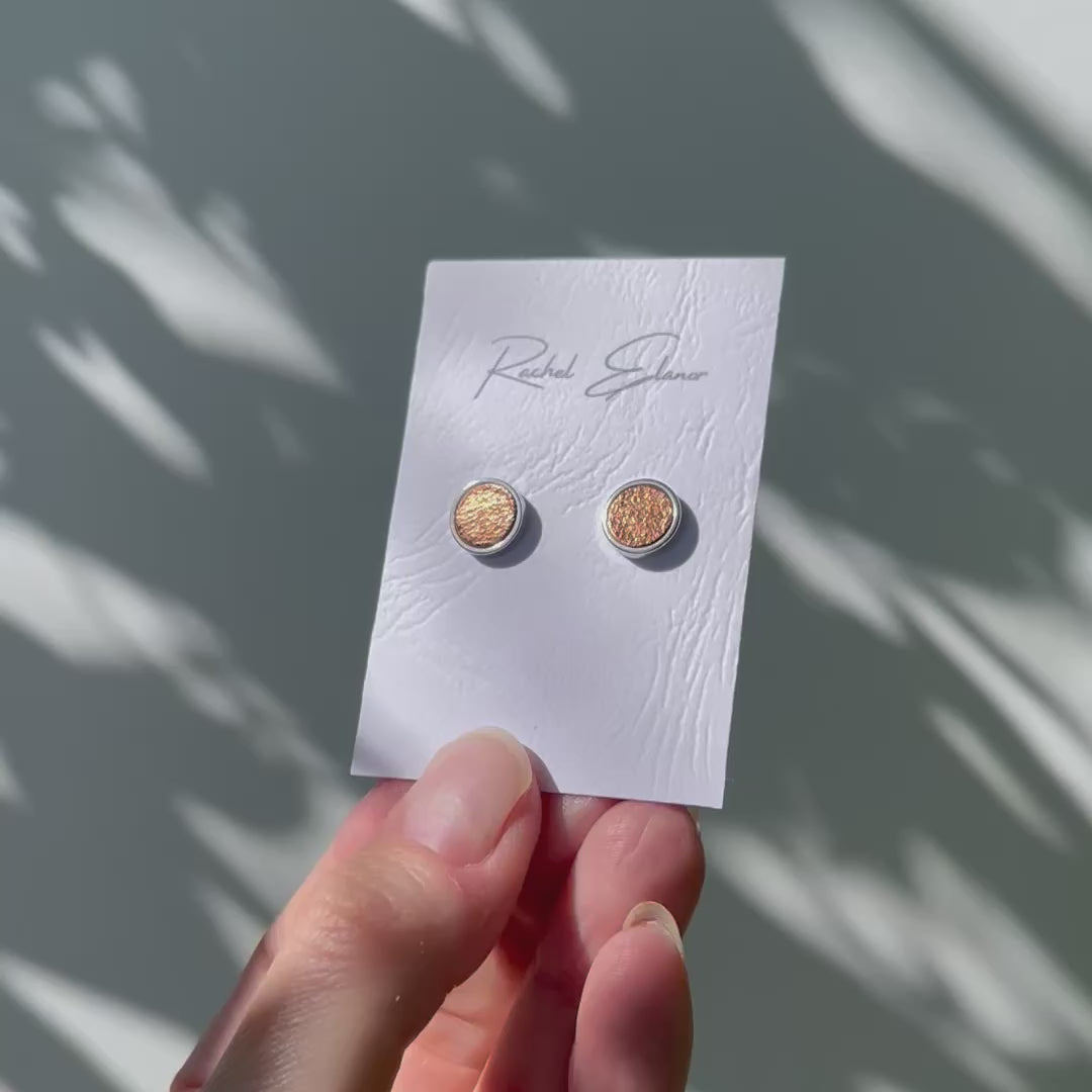 Metallic leather stud earrings in bronze to add a bit of sparkle to your everyday outfits. The metallic finish catches the light beautifully and offers a unique, chic alternative to other jewelled earrings. These studs are incredibly lightweight and made with hypoallergenic surgical steel so even the most sensitive of ears can enjoy them for hours on end.