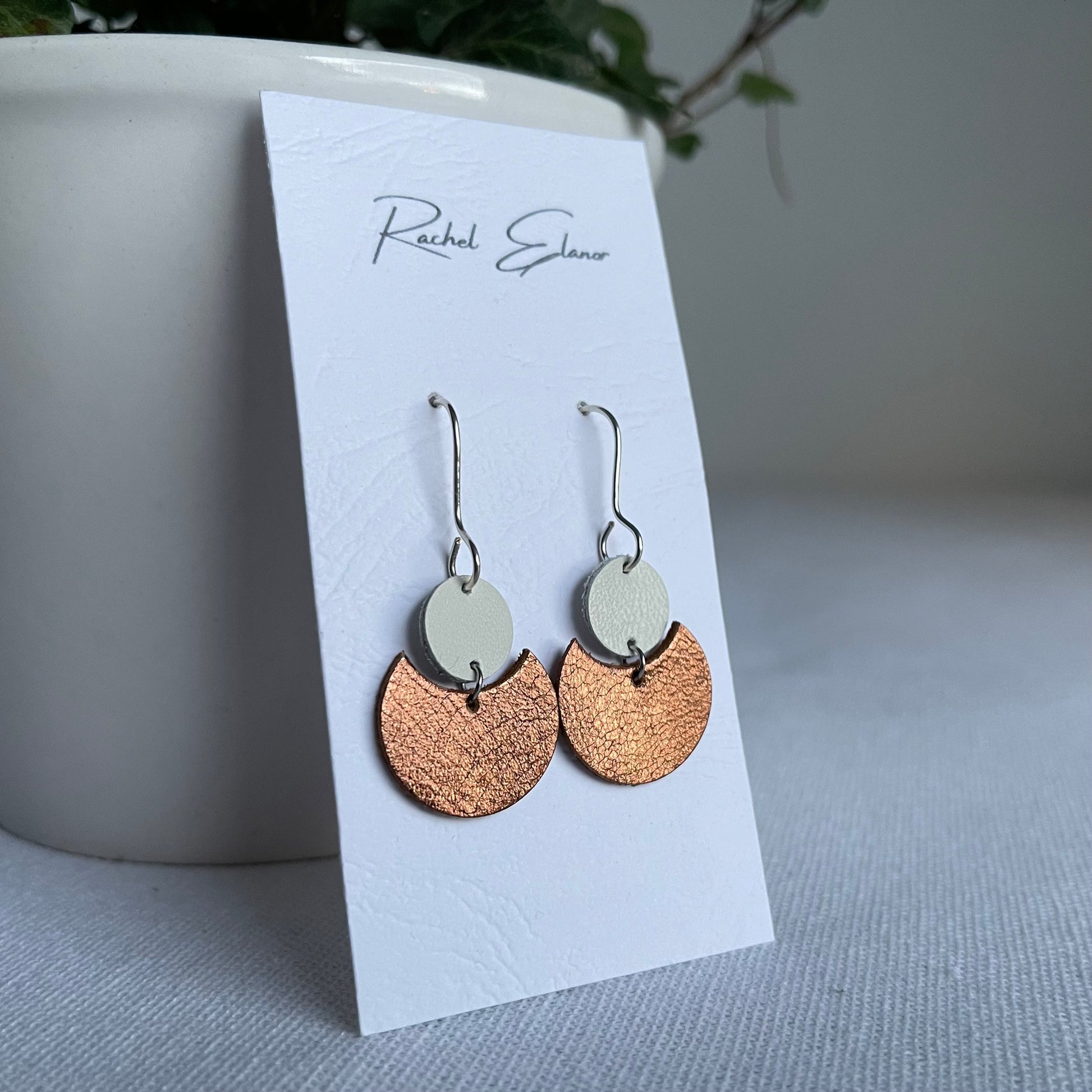 Metallic bronze geometric leather earrings with a white smaller circle accent in a short drop style. These earrings are incredibly lightweight and made with a handmade shepherds hook earwire in recycled 925 sterling silver.