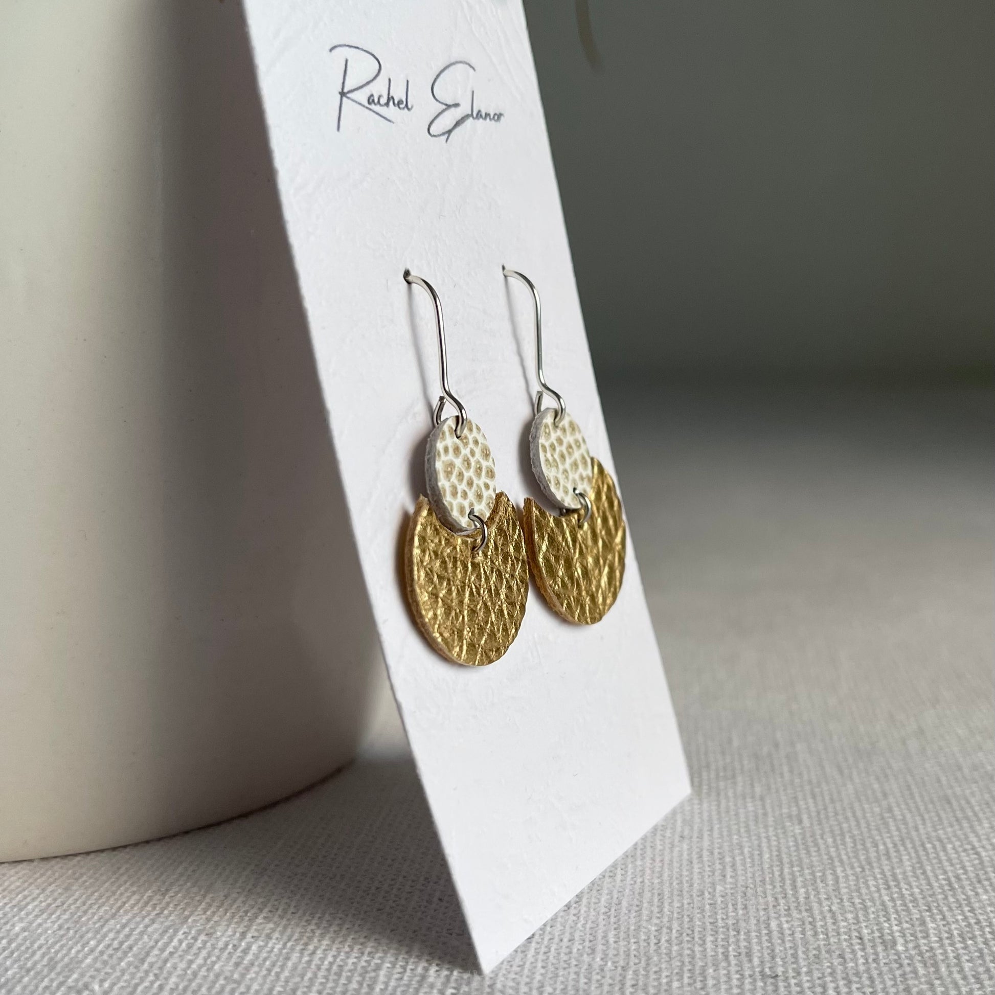 Metallic gold geometric leather earrings with a white and gold smaller circle accent in a short drop style. These earrings are incredibly lightweight and made with a handmade shepherds hook earwire in recycled 925 sterling silver.