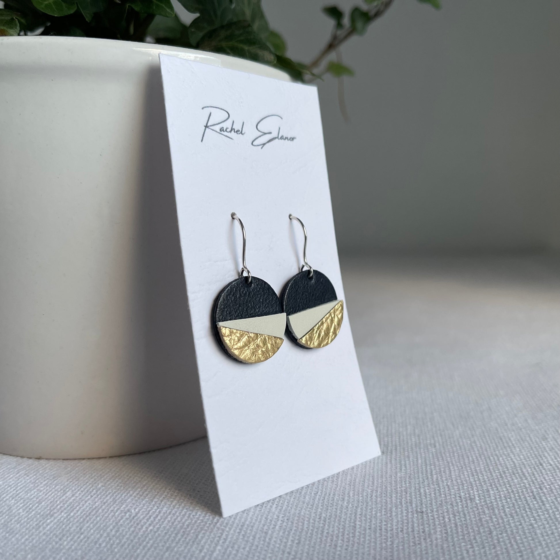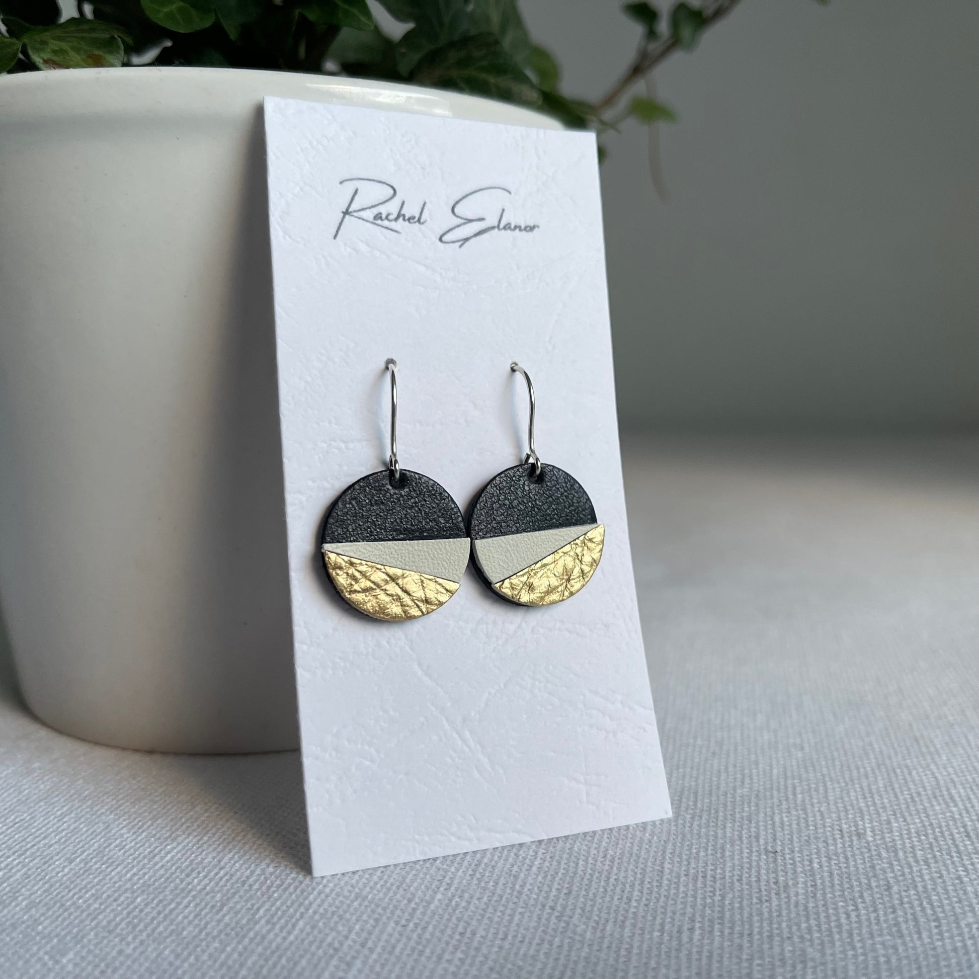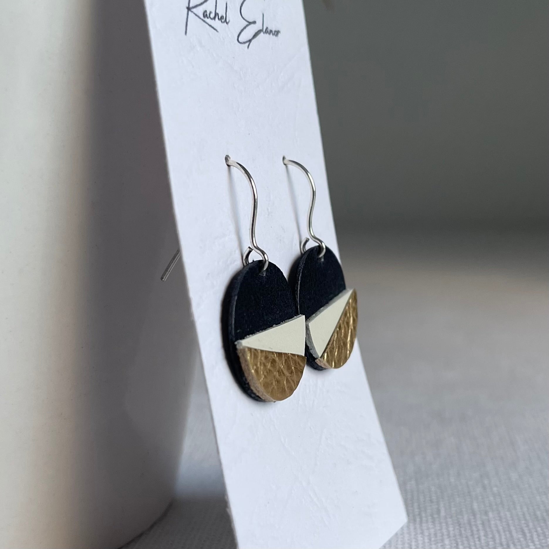 Dark navy circle leather earrings with metallic gold and white accents in a short drop style. These earrings are incredibly lightweight and made with a handmade shepherds hook earwire in recycled 925 sterling silver.