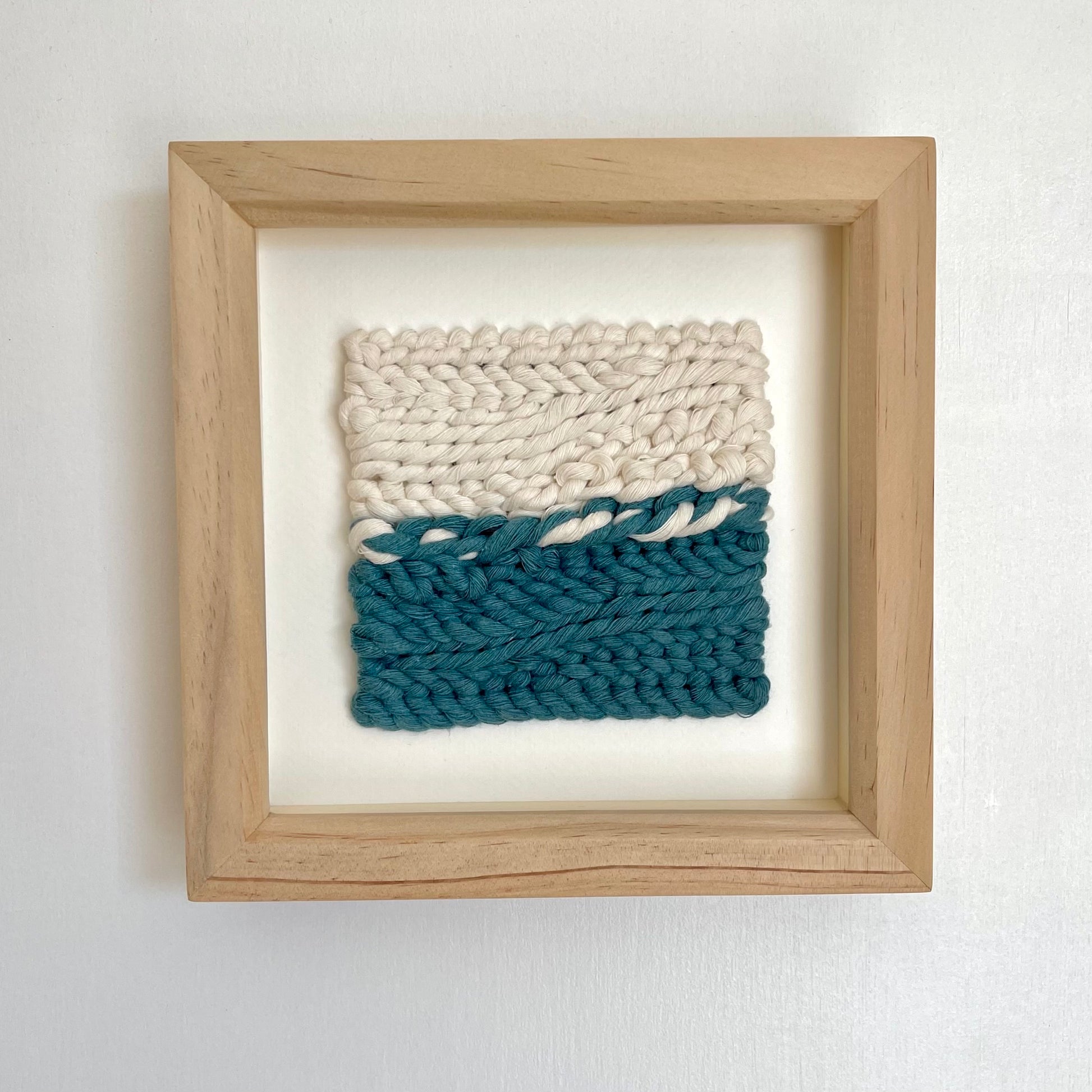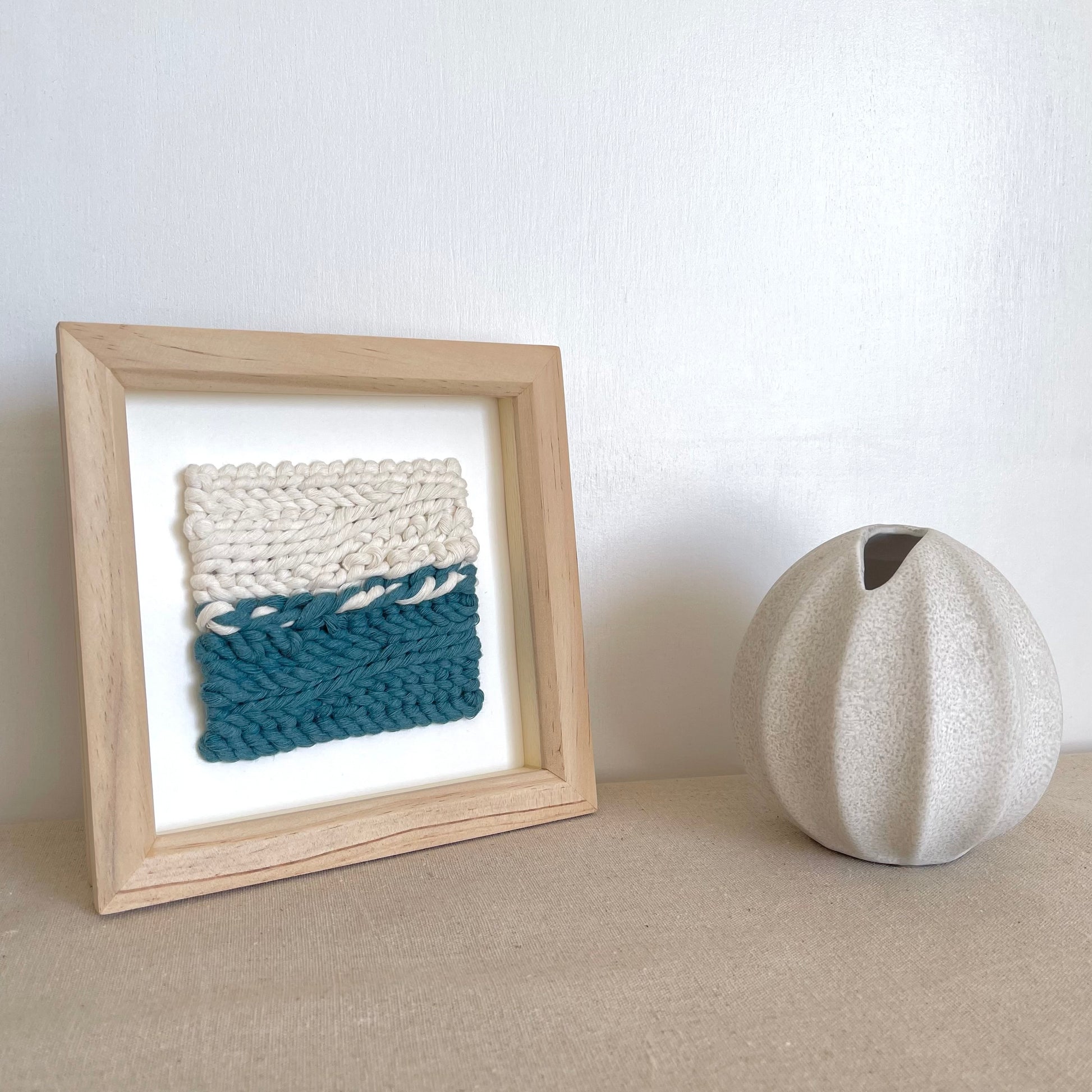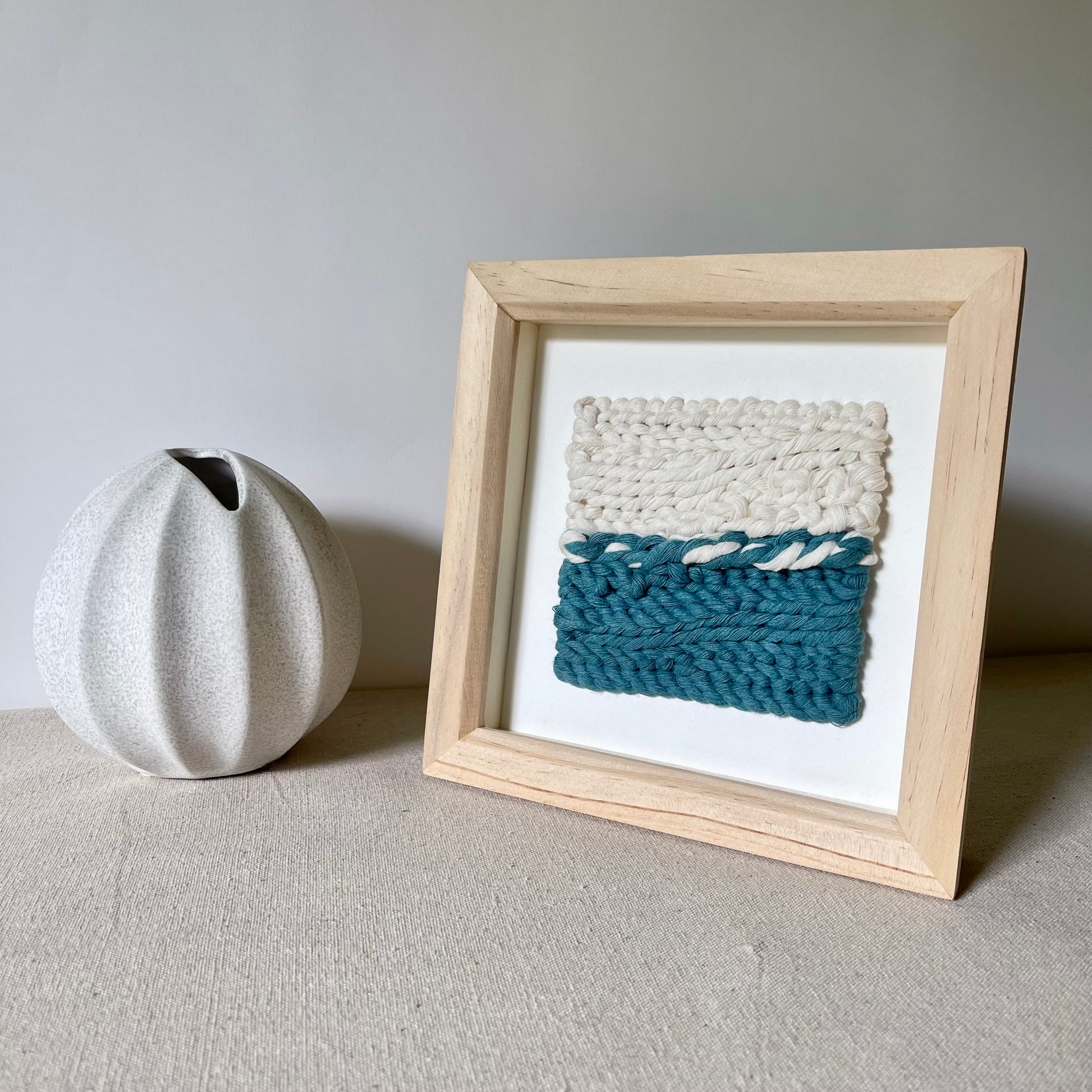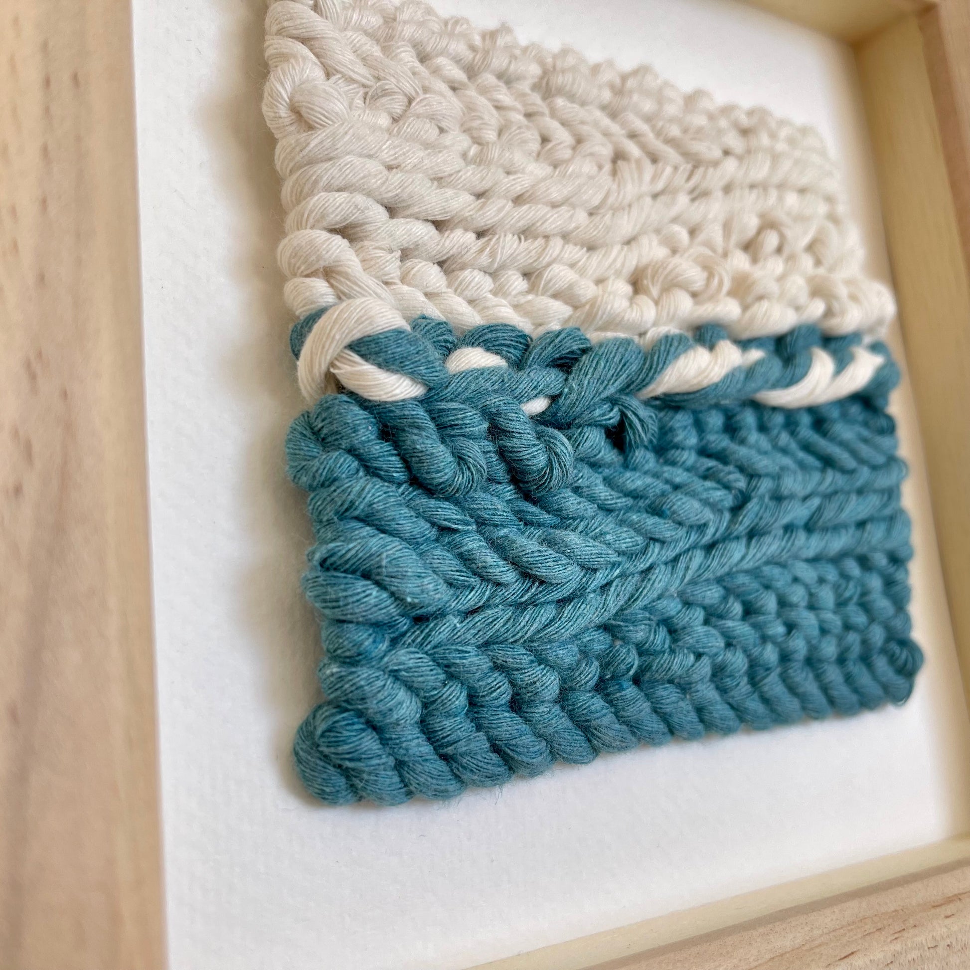Lovingly handwoven by the Cornish coast, this smaller sized soft textured fibre artwork will look great on a shelf, desk or small wall space. Crafted using recycled cotton cord in teal and cream ocean tones, with a minimalist Scandi vibe in mind to soothe the space it inhabits.