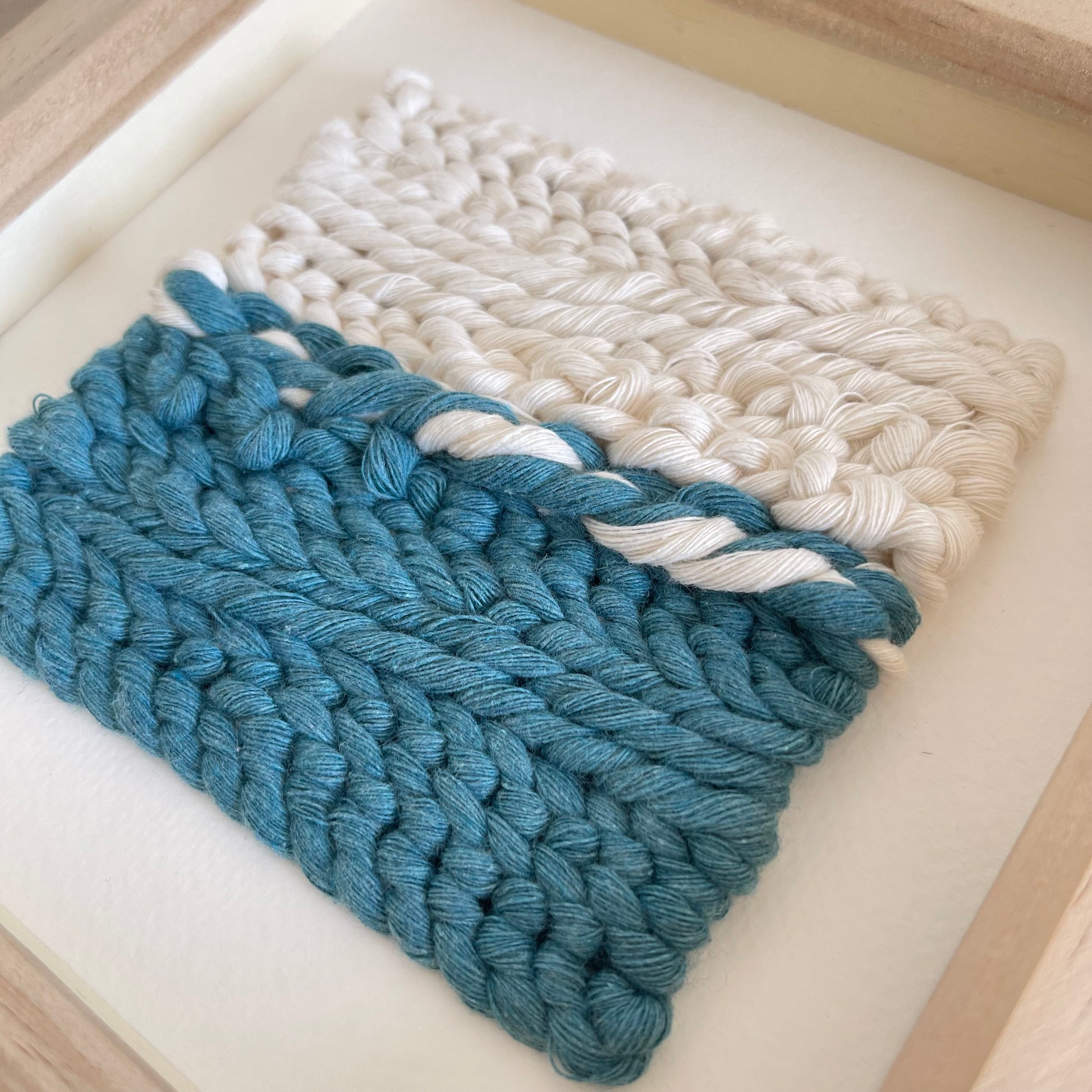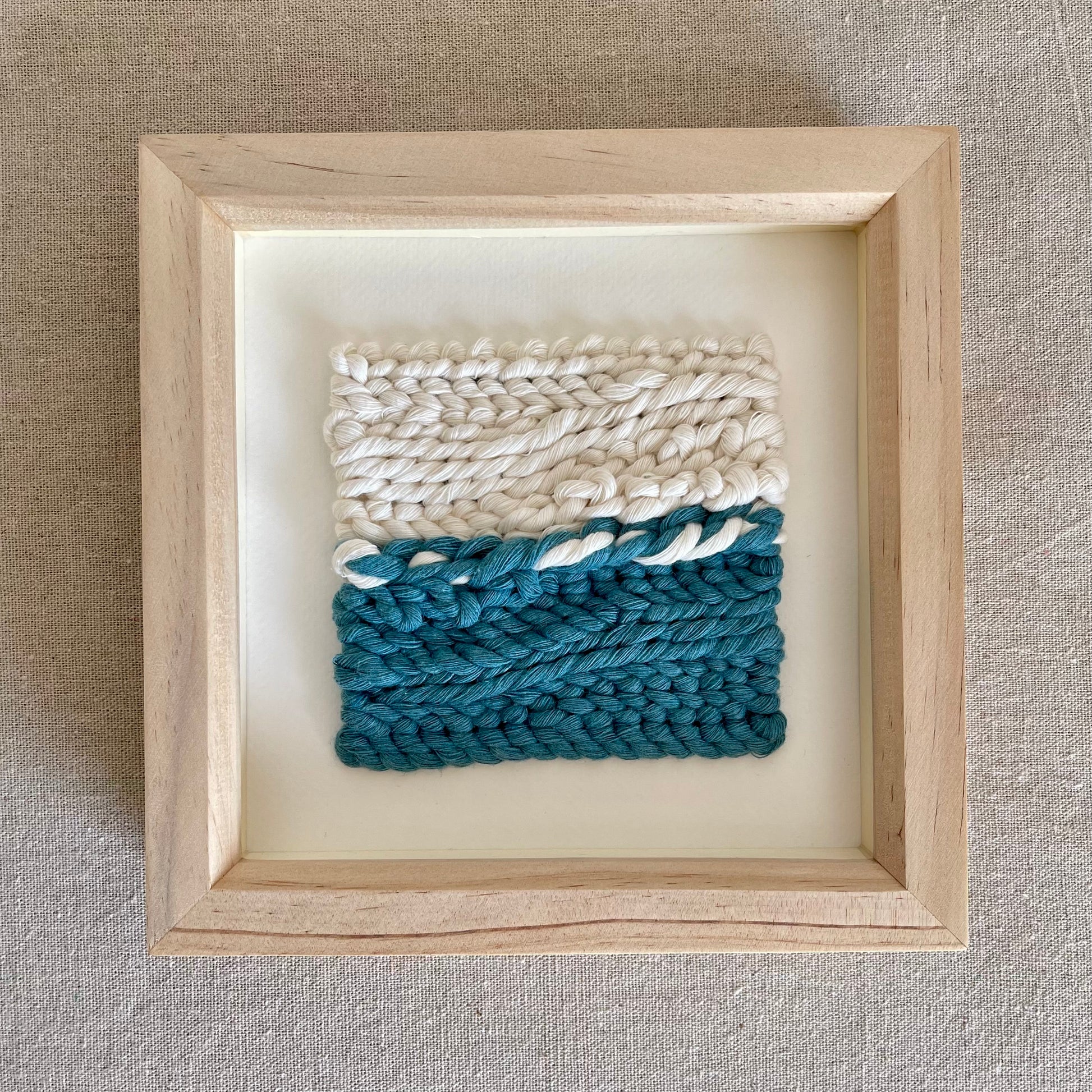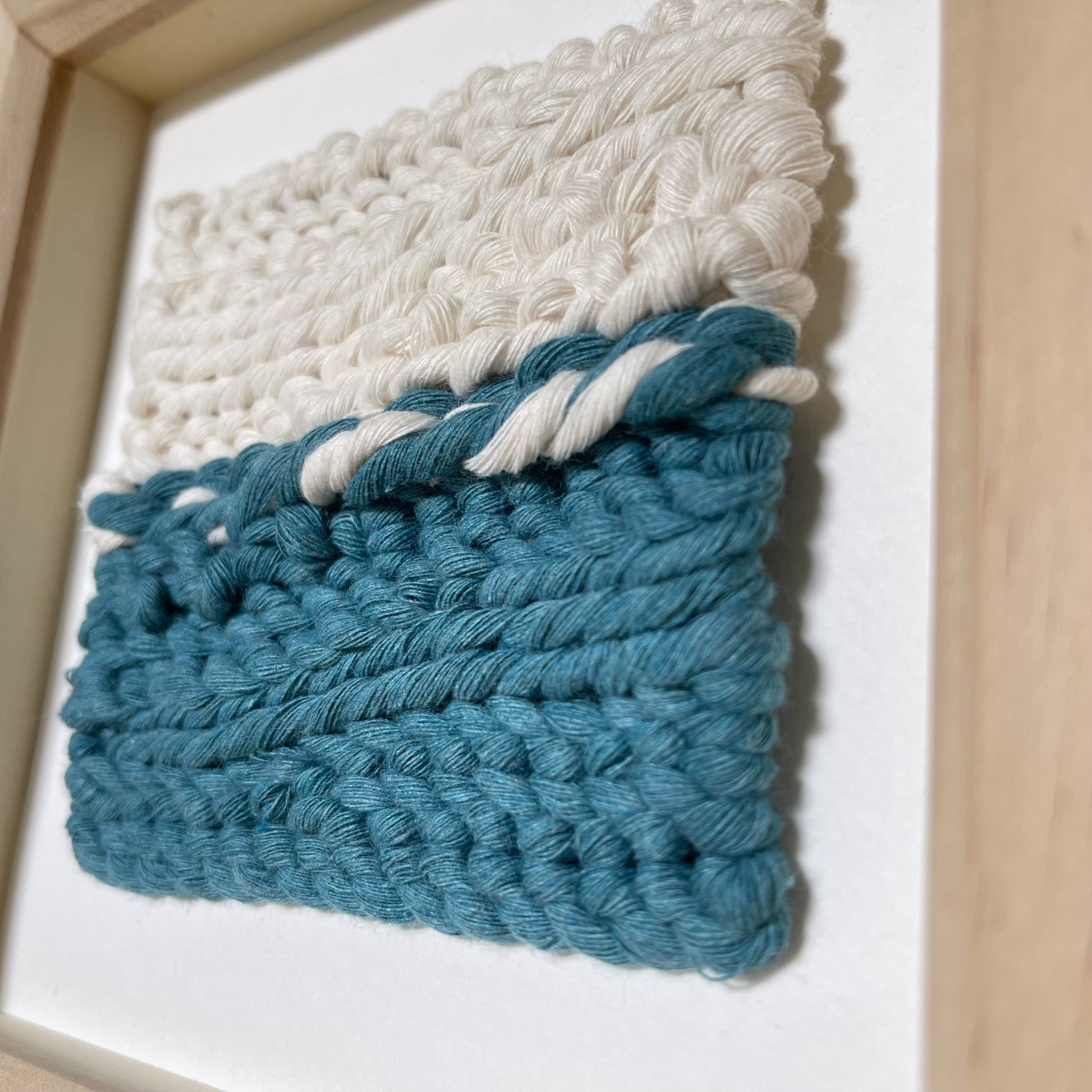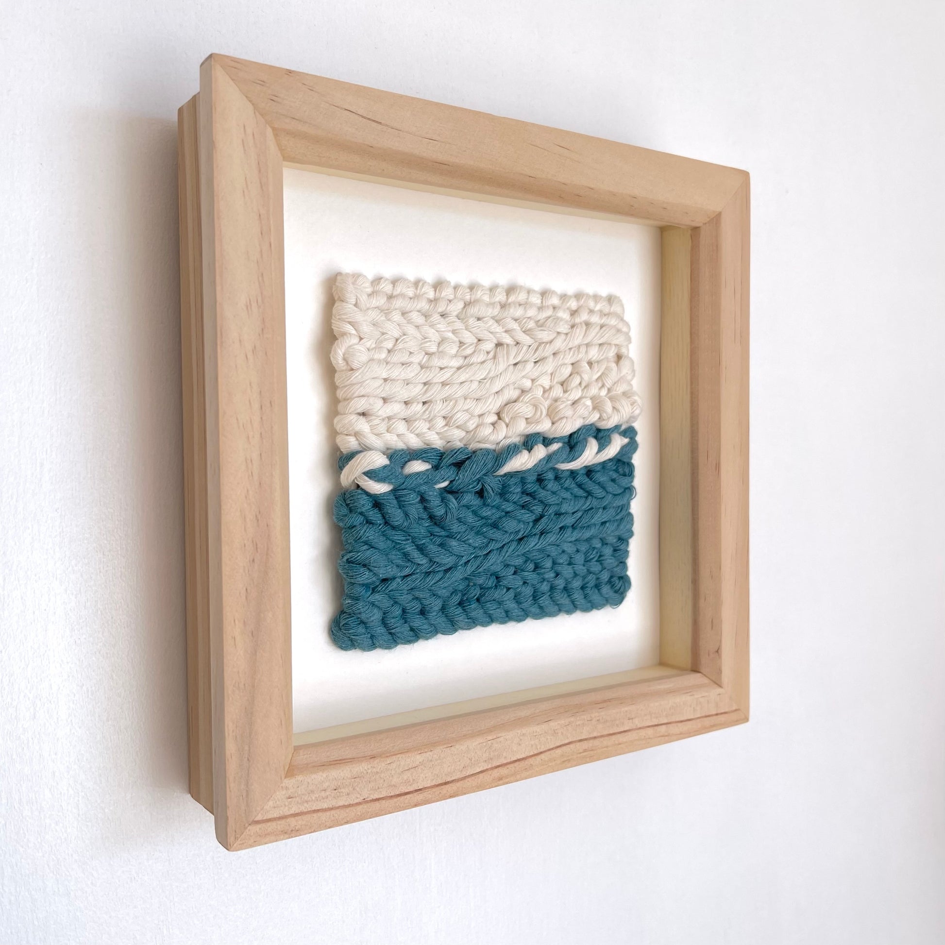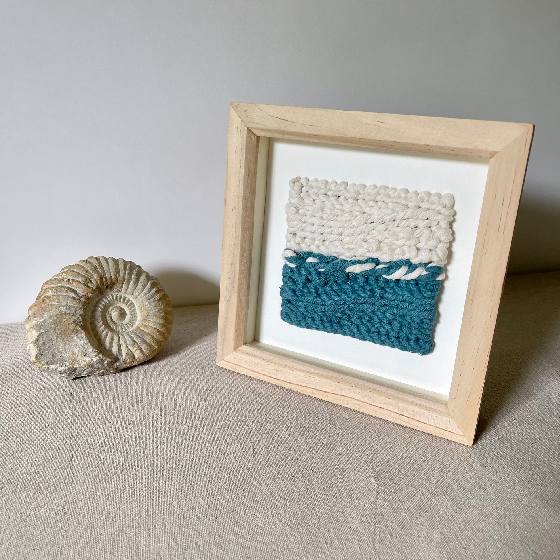 Lovingly handwoven by the Cornish coast, this smaller sized soft textured fibre artwork will look great on a shelf, desk or small wall space. Crafted using recycled cotton cord in teal and cream ocean tones, with a minimalist Scandi vibe in mind to soothe the space it inhabits.