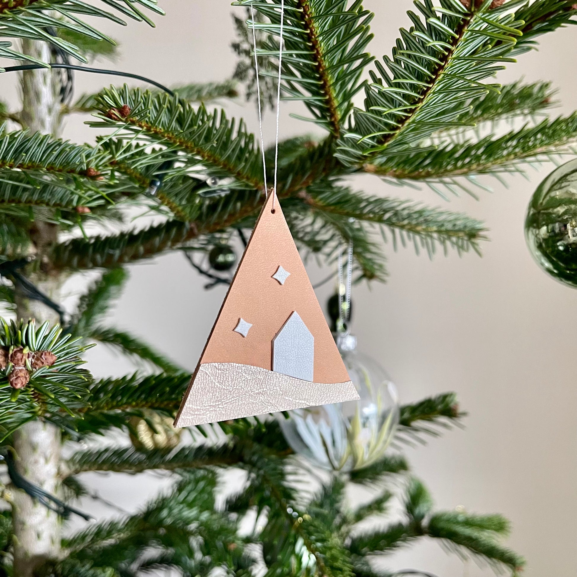 Scandi winter scene leather hanging decoration. Mix and match with your favourite decorations to create a unique tree or garland display.