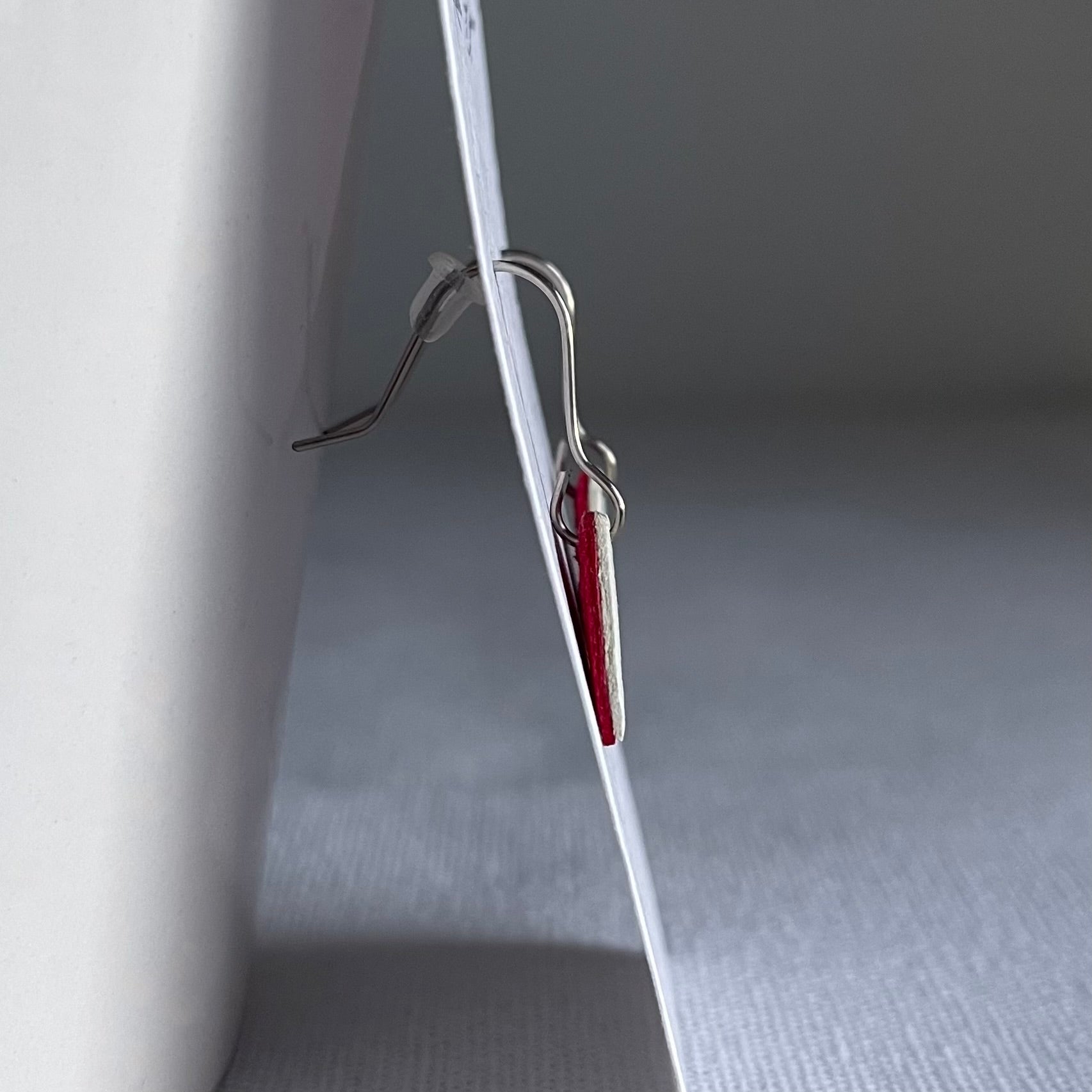 Cerise pink semi circle leather earrings with a white crescent accent in a short drop style. These earrings are incredibly lightweight and made with a handmade shepherds hook earwire in titanium. Titanium is a slightly darker shade of silver to sterling, it is non-tarnish and ideal for hyper sensitive ears.