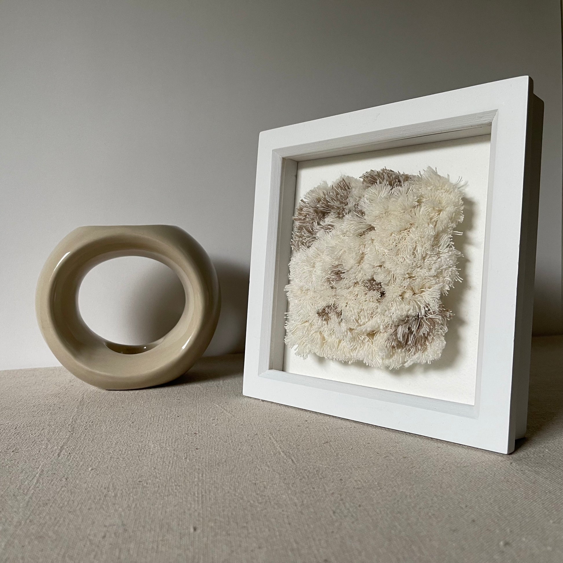 Made with recycled cotton cord, mounted on card and framed in a wooden deep box frame (no glass) with hanging hook.