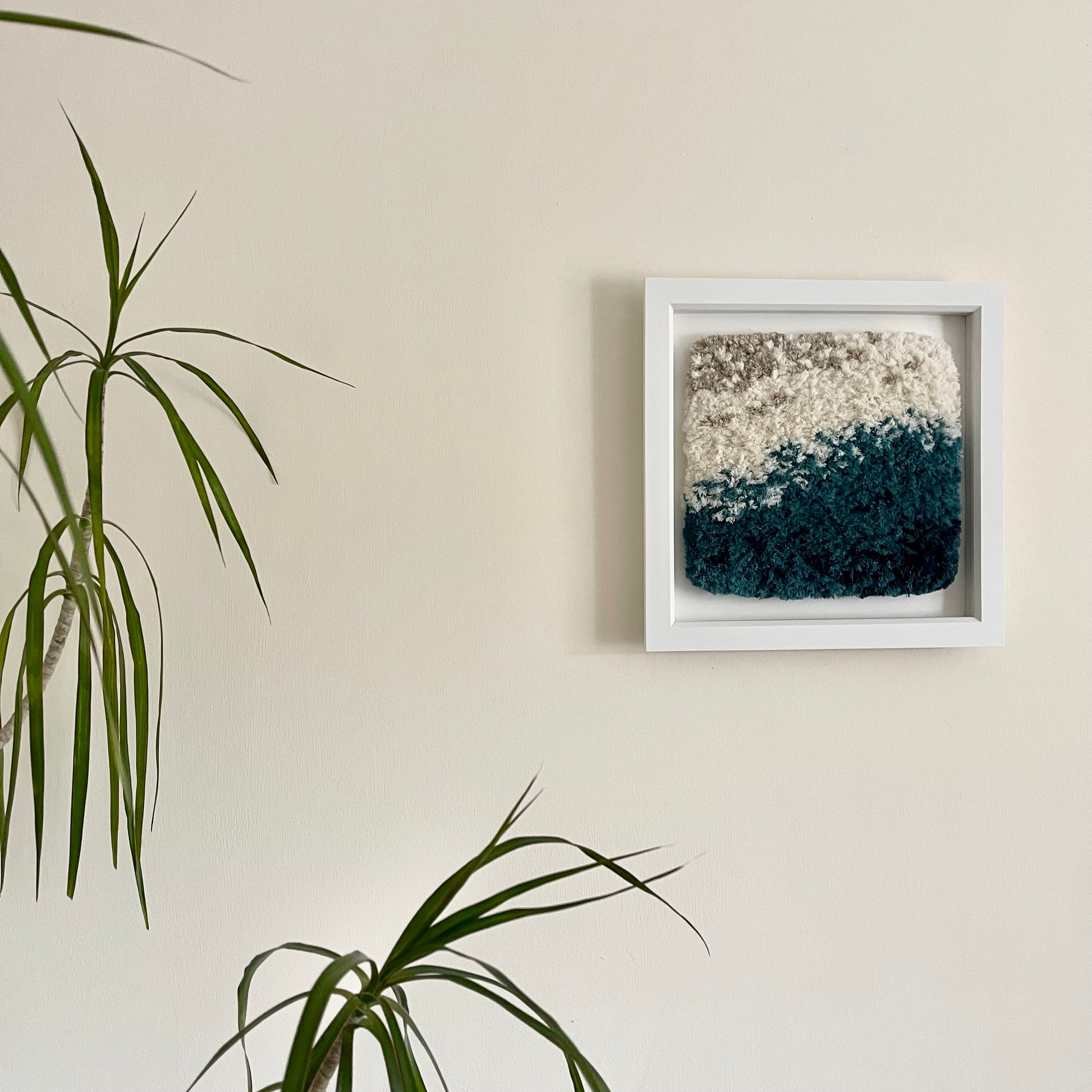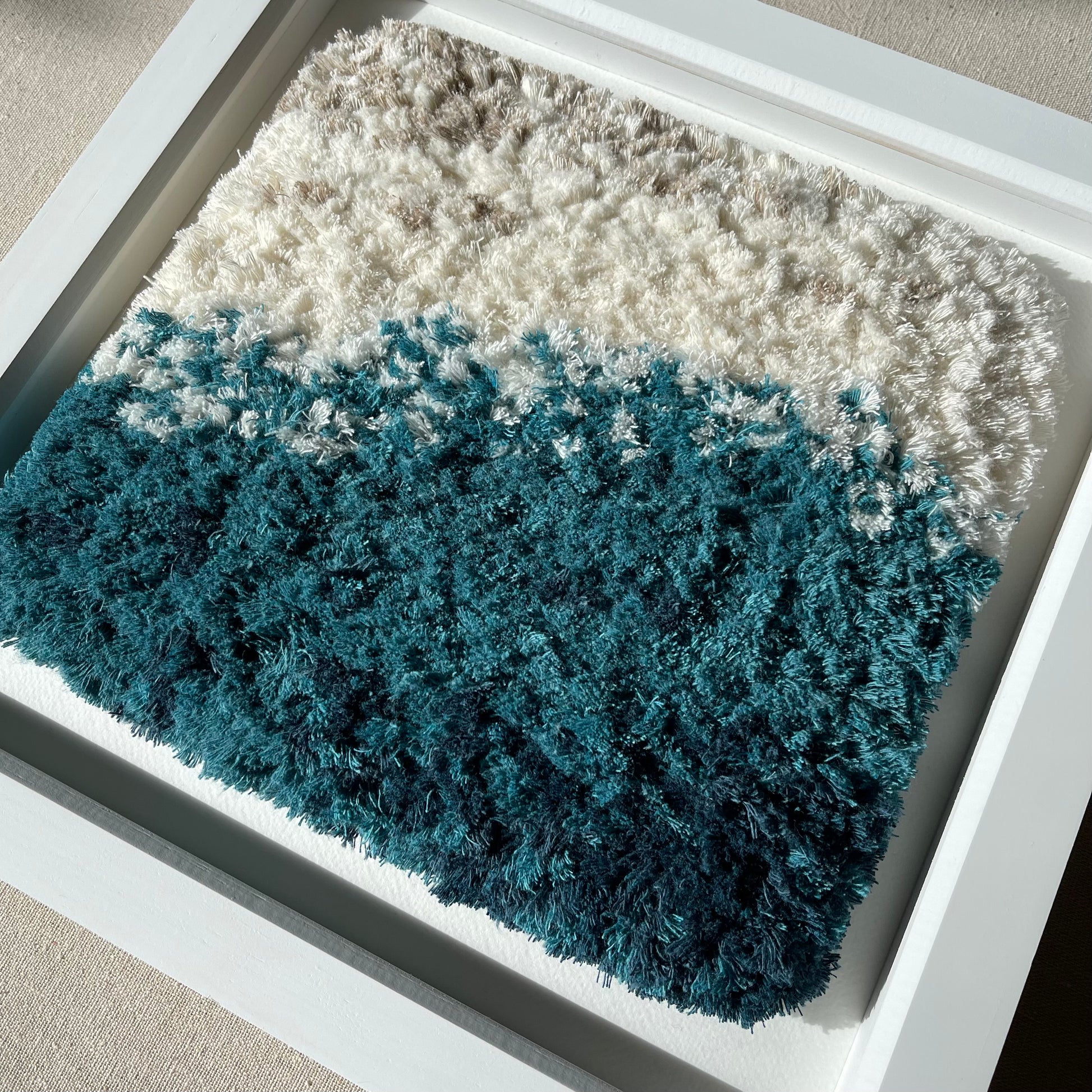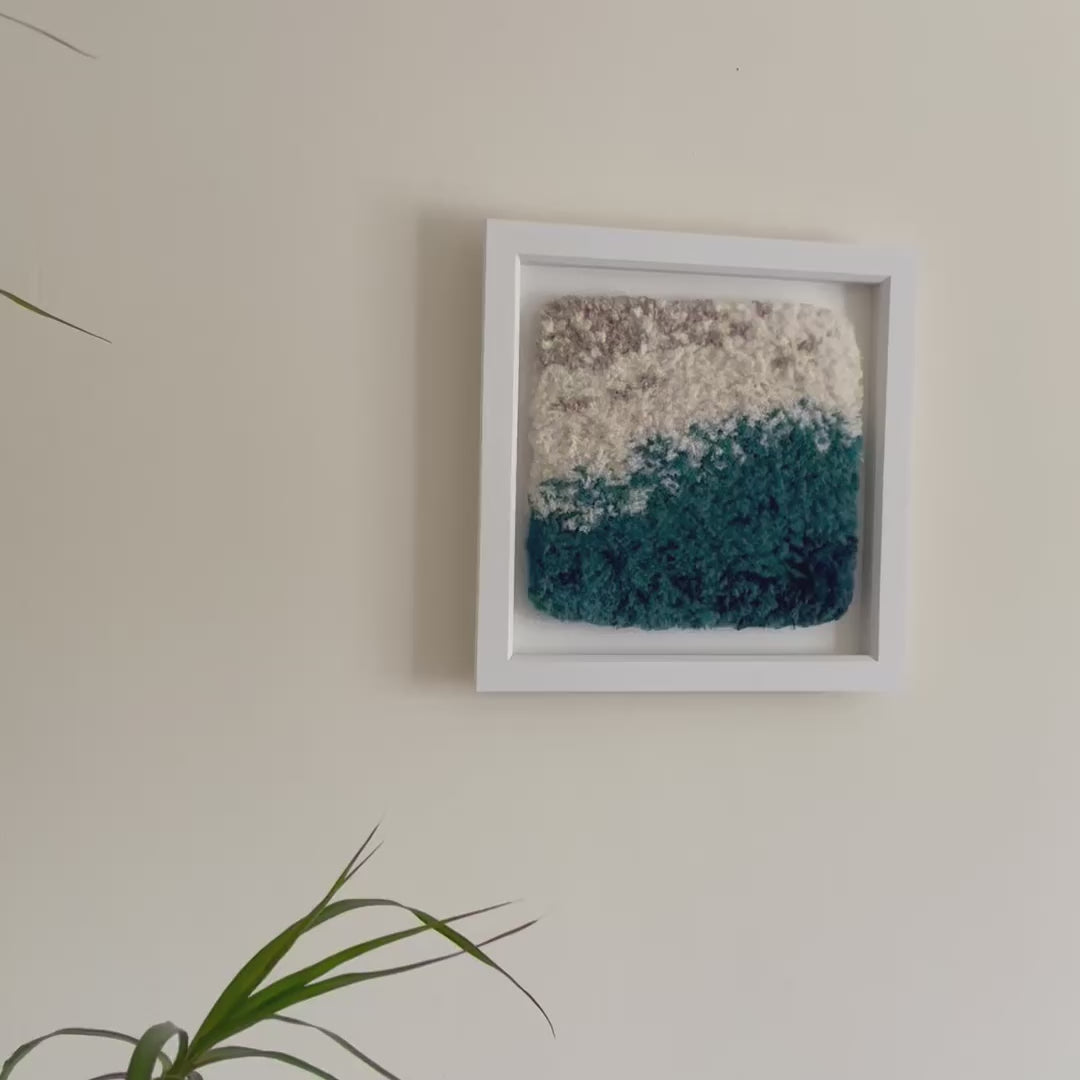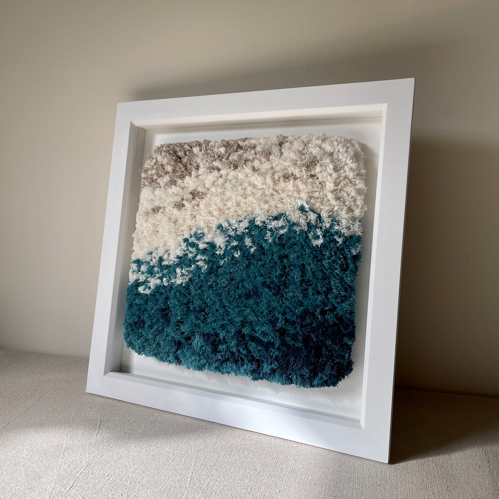 Made with recycled cotton cord, mounted on textured card and framed in a wooden deep box frame (no glass) with hanging hook.