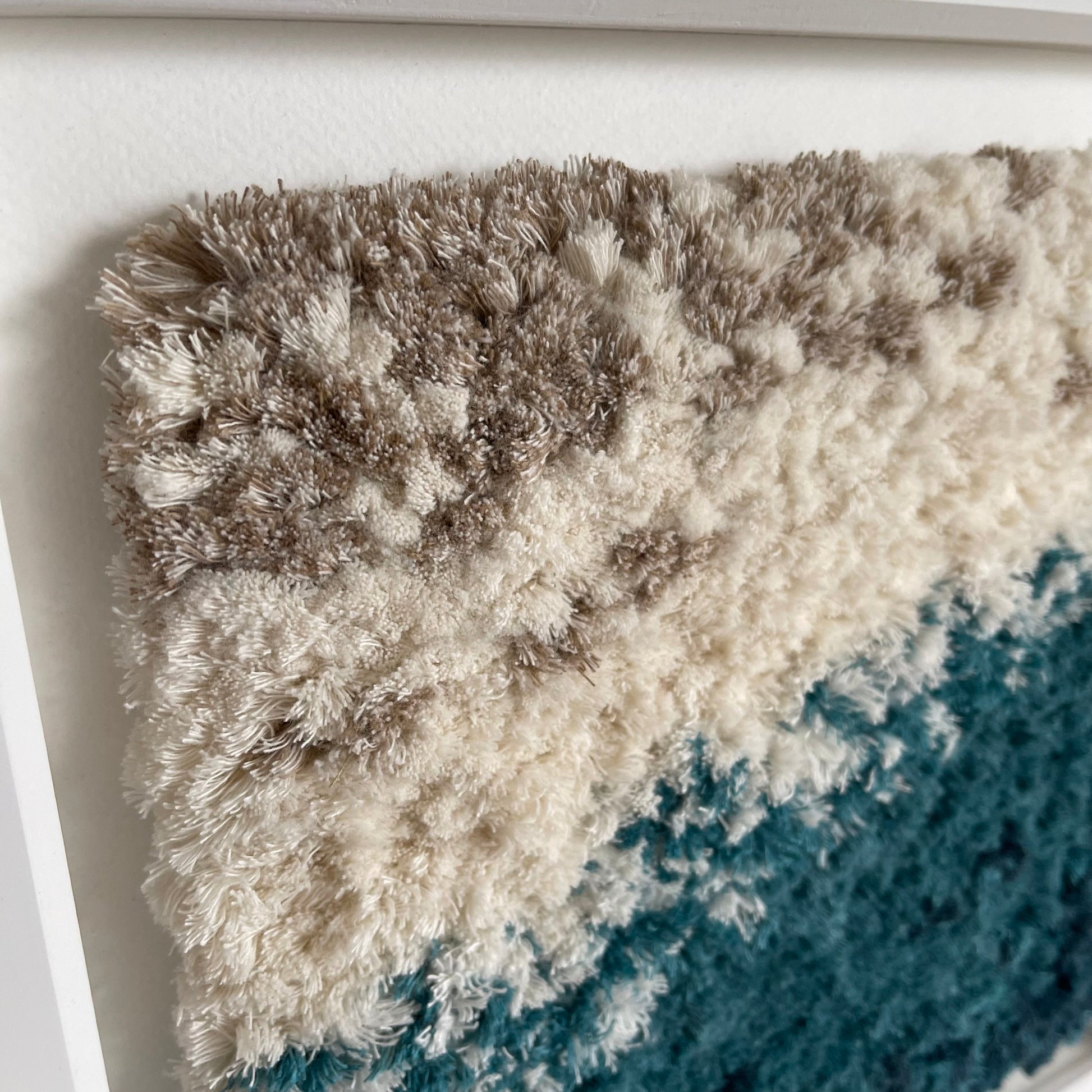 Large framed woven artwork forming part of the beautifully textured Shoreline collection inspired by warm, sunny days at Gylly beach in Falmouth, Cornwall. Reflecting the ever-changing edge of the tide, this piece captures the soothing blend of soft sand and turquoise water, inviting a sense of peace into your space.