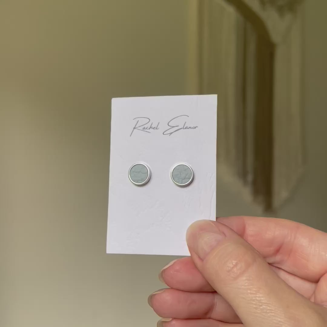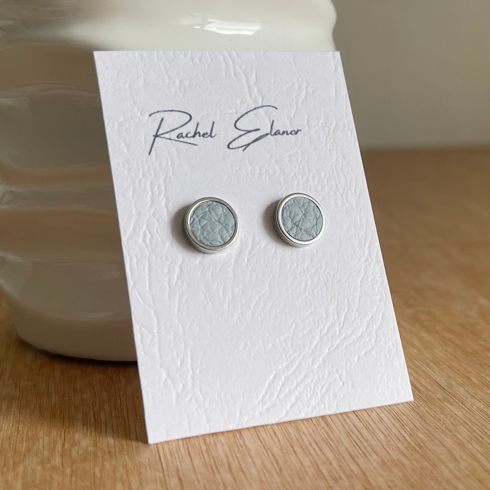 Light sky blue leather stud earrings. These studs were designed with comfort in mind being incredibly lightweight and made with hypoallergenic surgical steel so even the most sensitive of ears can enjoy them for hours on end.