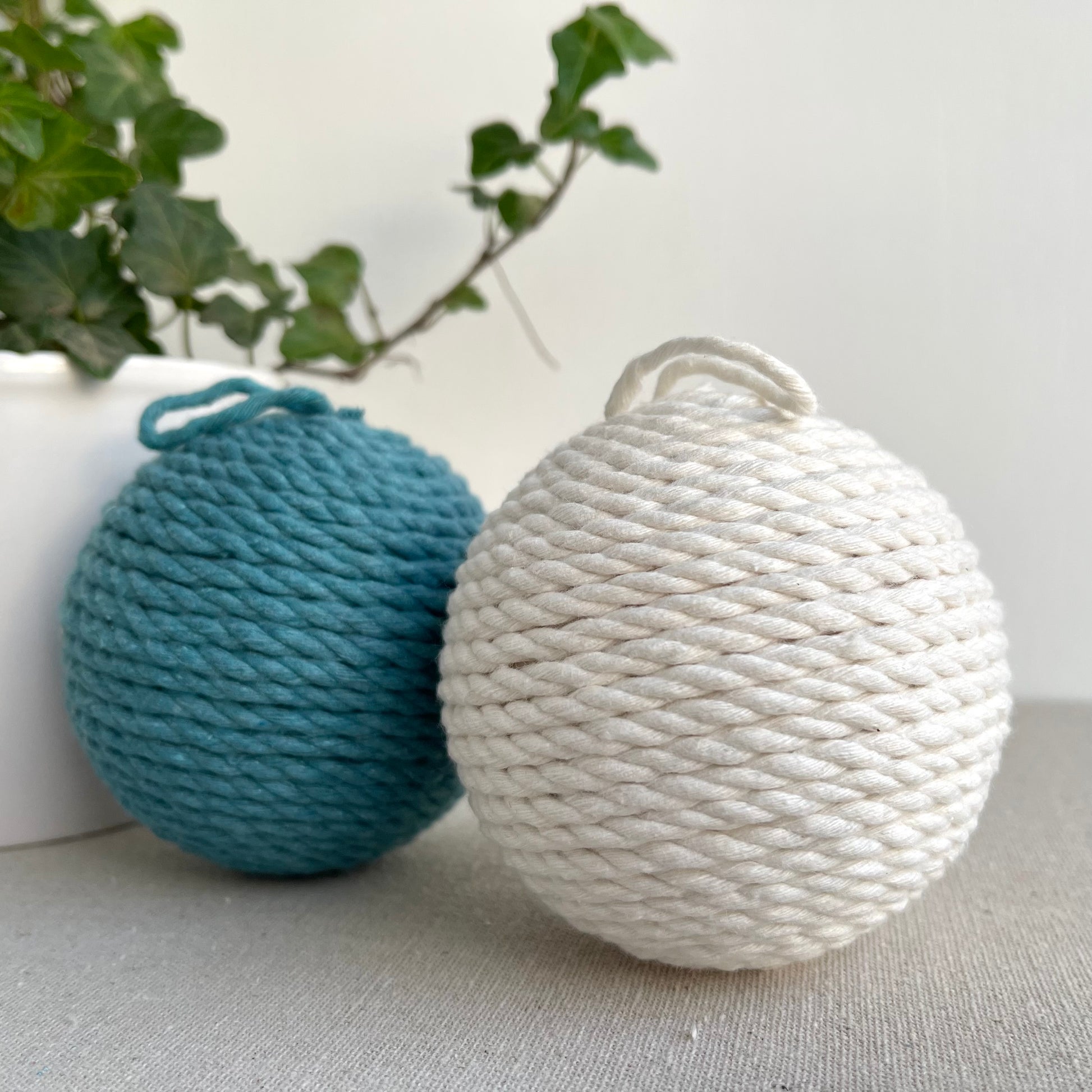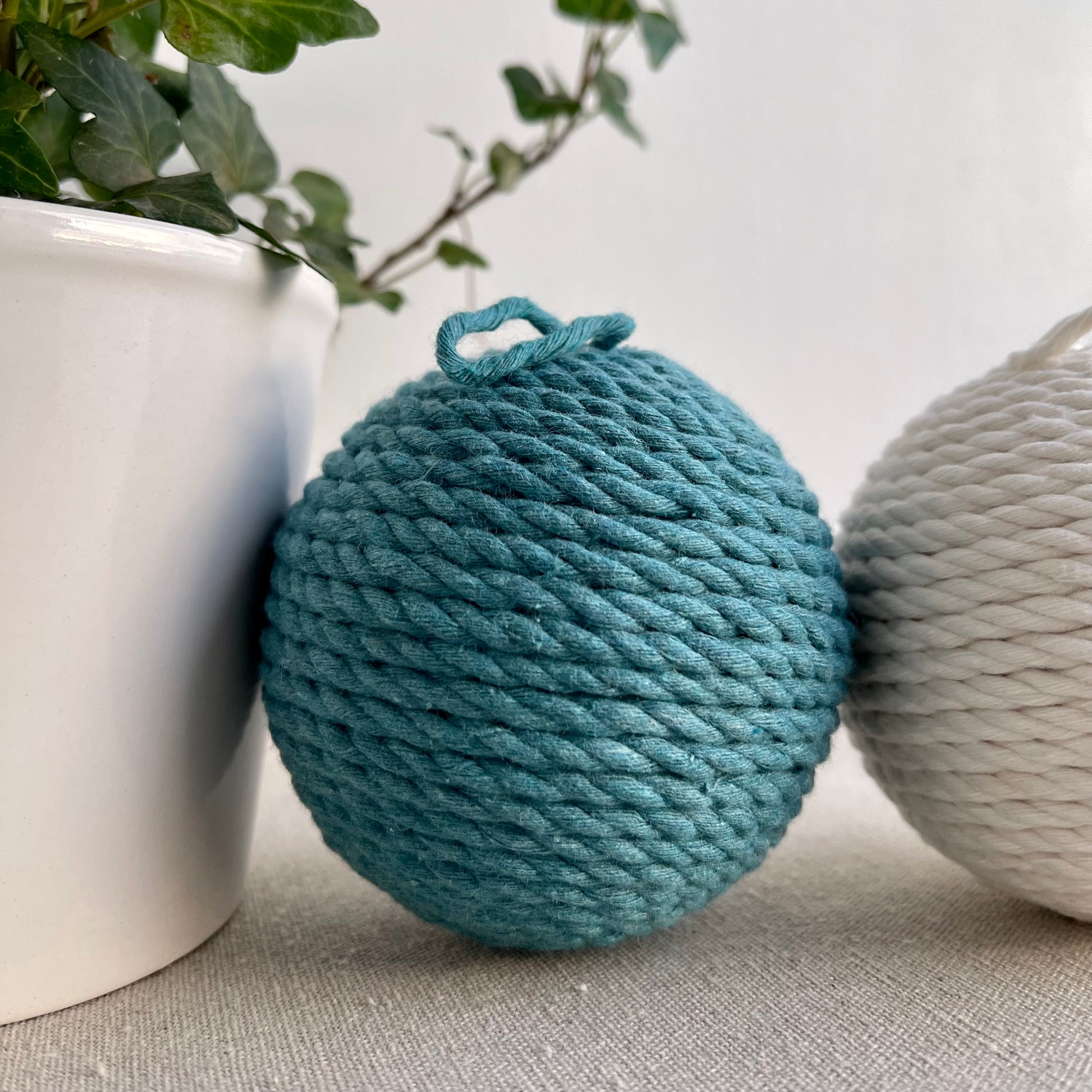 Set of 3 teal and cream decorative rope balls. Use as paired back Christmas baubles or all-year-round home decor accessories. Match with your favourite fibre artwork for a complementary home decor set.