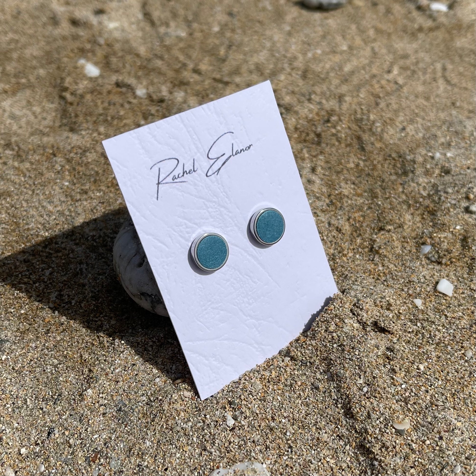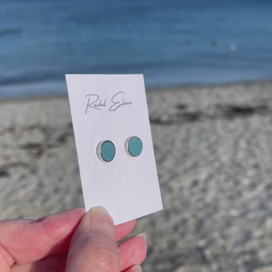 Deep turquoise leather stud earrings. These studs were designed with comfort in mind being incredibly lightweight and made with hypoallergenic surgical steel so even the most sensitive of ears can enjoy them for hours on end.