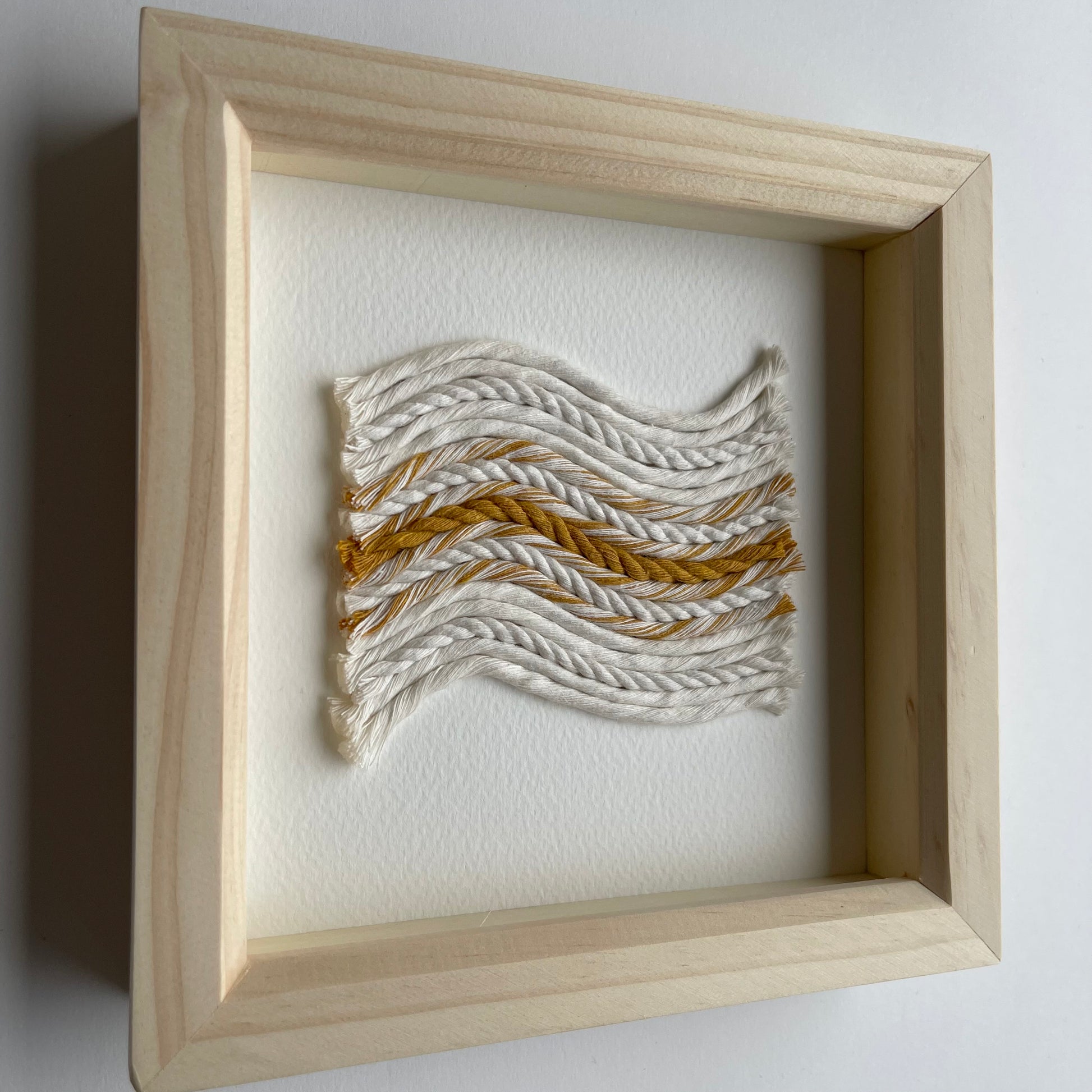Made with recycled cotton cord, mounted on acid free card and framed in a natural pine wooden deep box frame with hanging hook. Please note photos are taken without the glass due to reflections, but the frame will come with the glass in place.